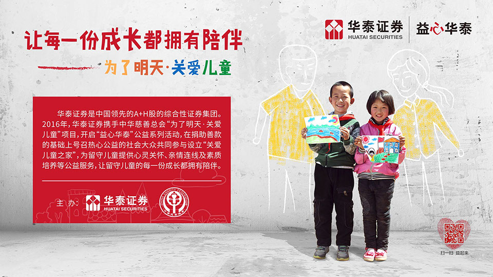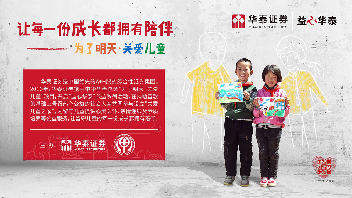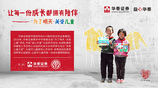 华泰证券作为国内排名前列的综合金融集团,在得益于中国经济发展红利的同时,也在践行社会公益的责任。在成立25周年之际,华泰携手中华慈善总会“为了明天 • 关爱儿童”项目,发起“益心华泰”系列公益活动。