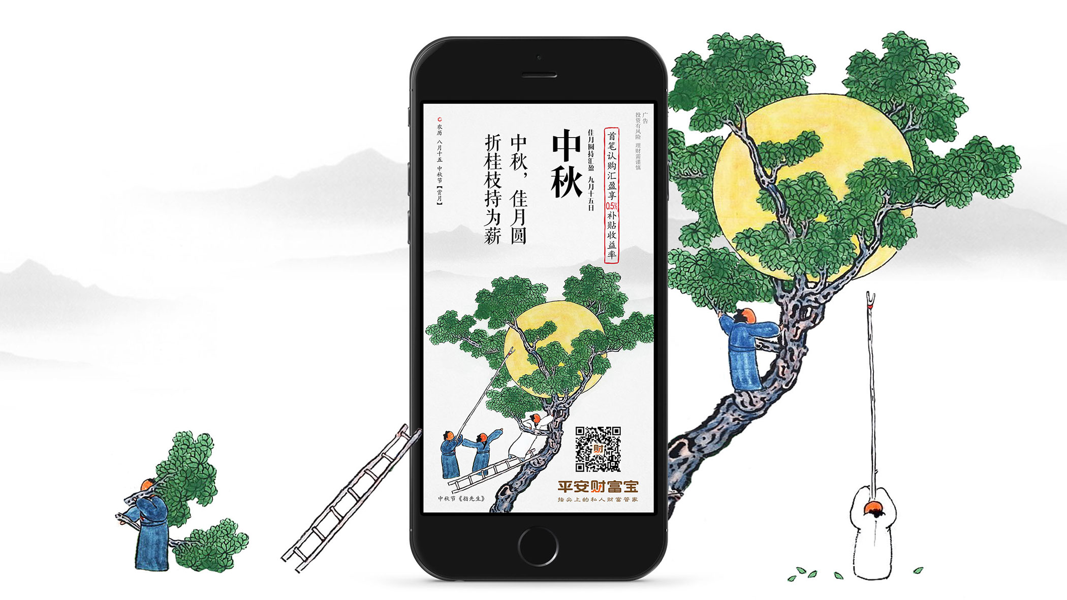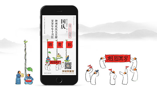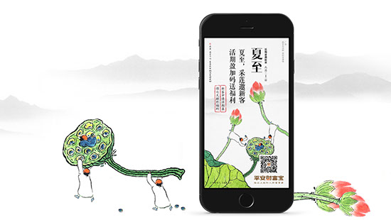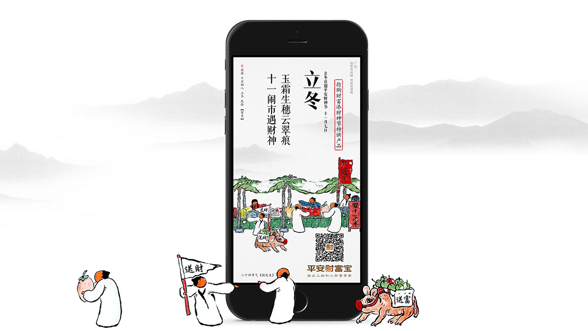 我们在梳理完成,不同节气内涵与品牌价值理念之间的搭配规律后,邀请建筑师曾仁臻(渔山)先生协作,借助其笔下园林人物形象,结合平安财富宝的品牌定位,塑造出“指先生”这一生动形象。再将产品的营销内容改编成七律诗词铺底,结合指先生的节气故事,用一图一文一世界的表现手法将品牌价值点,产品营销与不同节气的自然特点,人物故事予以巧妙的结合。